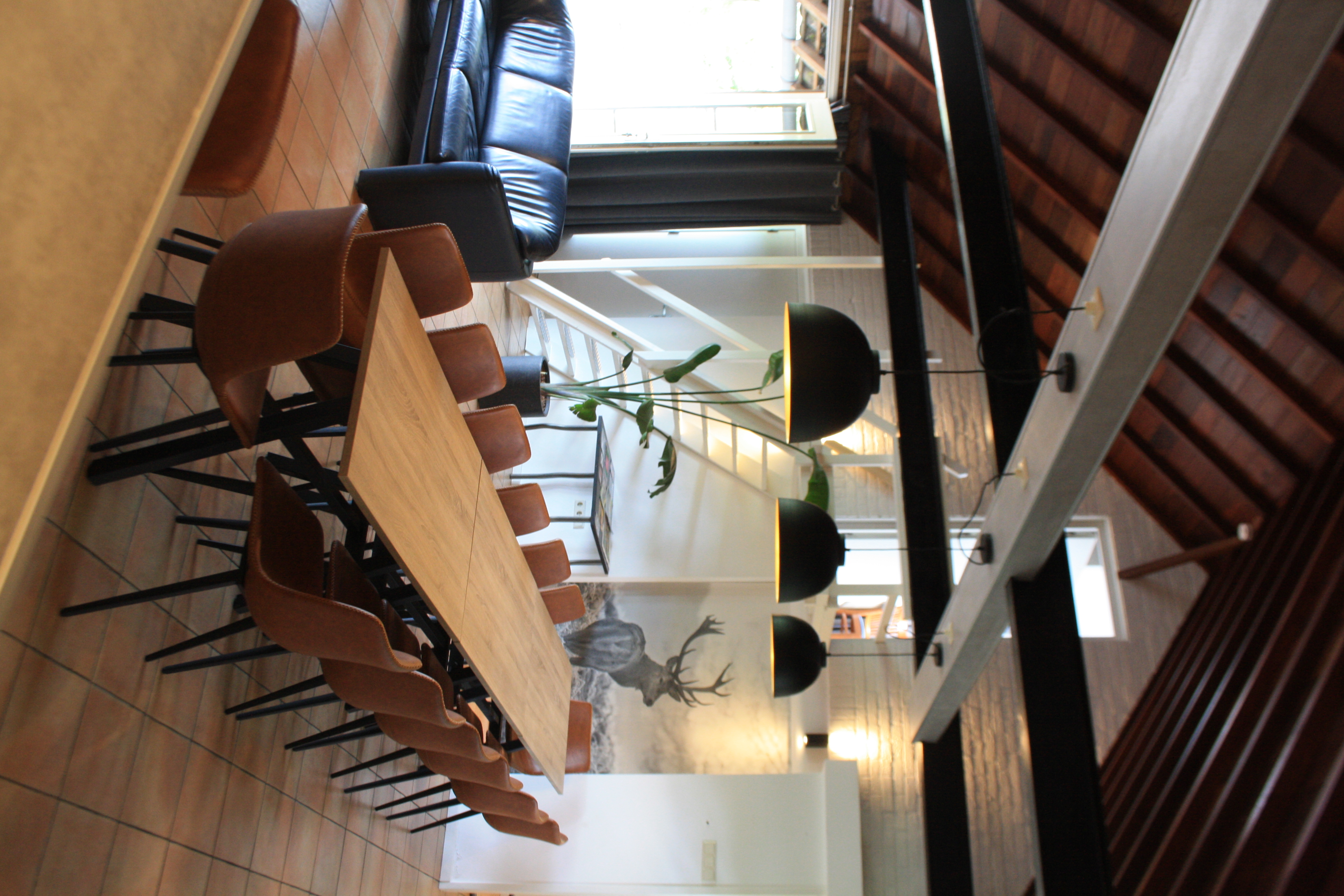 Zithoek met banken en fauteuils, LCD-tv, stereo/cd speler, grote eettafel, houtkachel.